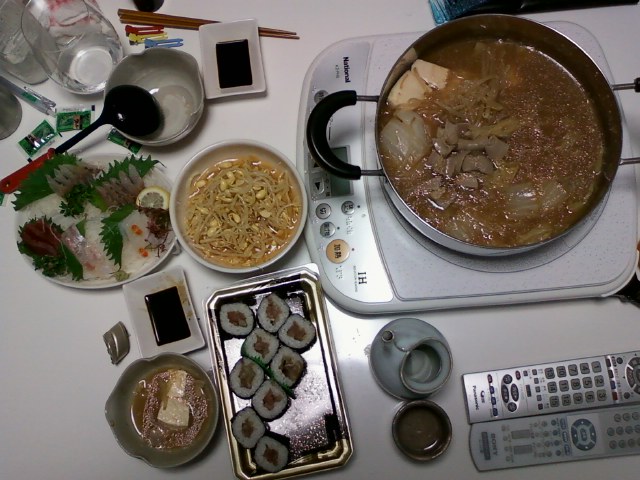 (鉄火巻、刺身盛合せ、モヤシキムチ、モツ鍋&日本酒)